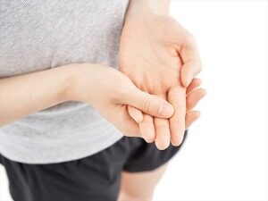- 指の付け根(手のひら側)を押すと、コリコリしたものがあり、強い痛みがある。